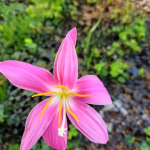おはようございます😊 今朝の庭です😄 ① 朝ラインのゼフィランサスかなー😍 ② 雨で大きく曲がったジニア💗 ③ 頂いたホテイ草🌿🌱🌿 ④ 一番元気なサルビア😁💮 ⑤ まだかな〜ヒオウギさ〜ん💛😁