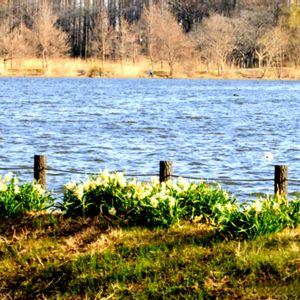 水仙の花 都立水元公園にて 水辺に植えられている水仙 向こう岸はみさと公園 以前撮った写真から🤳