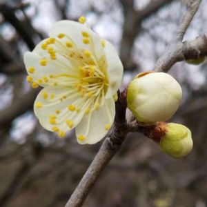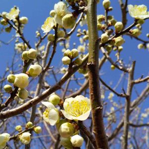 万博公園の梅林にて、つぼみは黄緑色、開くと白色の梅「緑萼(リョクガク)」をパチリ!💚💛🌼😊😄🤗🌞✌️