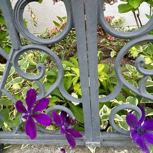 クレマチス 流星とビクターヒューゴ お隣りさんにはみ出ないように気を付けつつ、毎日配達に来てくれる方にも楽しんでもらえたらと♪