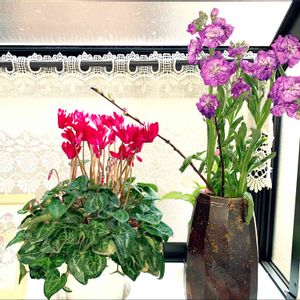 11月頃お迎えしたシクラメン➖🎶💖 丸3か月過ぎてもお花は次から次へと咲いてくれる❣️😊 暖かい部屋はダメ🙅♀️お水のあげ過ぎもダメ❎…と甘やかさないでいると、何度も花がへべれけになって🥴クタッとする事…数度⤵️😖💧 それでもお水をたっぷりあげると元気になって💪💨💨生き返る🙌🙌🙌💕🌼💕🌼💕✌️ ストックと一緒にJAで買った桃の花2本🌸 こちらは残年ながら😭殆どが買った時から桃の花が黒くなって処分👋 買った私が悪かった😬💧💦