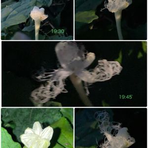 ✨カラスウリ 21時10分撮影 🐕散歩中に見かけた〜! 夜に開いてるみたいで📸パシャしました\(^o^)/💕 朝の散歩では‥萎んでいます😅 😊