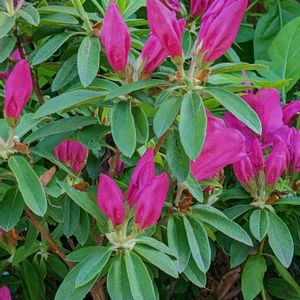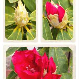 実家の庭のシャクナゲさん✨💓🌿 3月頃からずっとつけてた蕾が、今やっと開き始めました~✨❇️👀😆🎵 (↓今日4月21日AM8時40分頃撮) 金曜日の蕾たち🏷に、よろしくでーす🌱
