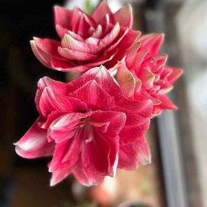 おはようございます。 花友さんからいただいた、アマリリス❤️ 咲きました🥰💕 頭が重くて倒れないかしらとちょっと心配。 まだいくつも蕾があるのよ。 花色も大好き❤ 毎日眺めて楽しんでいます。 もう一つの鉢も蕾が膨らんできてて、咲くのを待ってます。 待つのも楽しいわ。