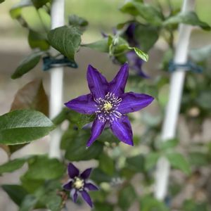こんばんは☁️ 20℃ 1.2枚目 去年タグなし処分コーナーにあったクレマチスが咲きました🥰 ジャックマニー系としか わからないんですが紫の中輪の一重が欲しかったのでドンピシャでした✨品種は何でしょうね どういうのが咲くかわからないのもドキドキでした☺️ 3枚目はデニーズダブル💕 クレマチスを育てる楽しさを知ってしまいました白系も欲しいなぁ🤣