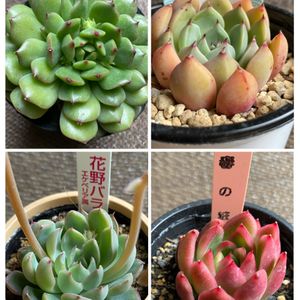 最近お迎えした子達❣️ ↖️ 〈エケベリア オレンジ〉 ↗️〈アップルパイ〉 ↙️〈花野バラ〉 ↘️〈春の粧〉 上2個は所⚪︎園芸店 お目当ての子は高くて我慢しました😓 下2個は城⚪︎⚪︎園芸店