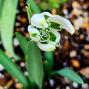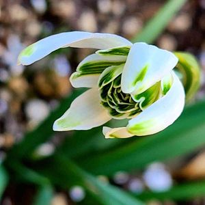 八重咲きスノードロップ 三分咲きぐらいです。 ノーマルスノードロップより 小さい子です♡ 先祖返りもせず八重で咲いてくれて 嬉しいです!!