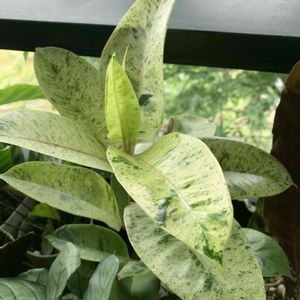 迷彩柄の斑が素敵なフィカス•ジン🪴 7/27に投稿したフィカス•アルテシマと同様にこちらのジンもベランダでお日様にガンガン当てながら育てています☀️ 遮光は全くしていないのに葉焼けもなく新葉を出し続けています🌱 この調子だと厳しい残暑も無事に越せそうですね🤗