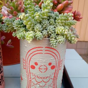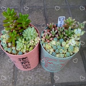 多肉屋さんに行ってきた話題を まだまだ引きずっていて… ドレッドヘアにしていたアマビエ缶の くたくたマジョールを短髪に🤭 もともと植わってたチビ苗と 狩ってきた虹の玉とオーロラで 隙間埋めました