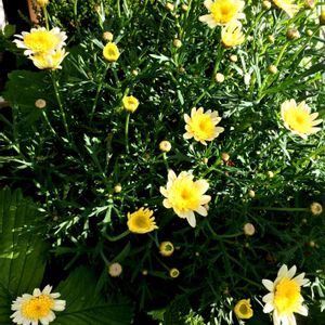 ボンザマーガレットがまたお花いっぱい🌼 アブラムシがついたのでお花をすべて カット✂️✨ 薬をふりかけて待つことひと月くらいかなぁ😌 また満開で復活です🌼🌼🌼 黄色仲間のビーダンスとコラボ✨✨✨ あ、2つともサントリーさんのお花ですね〜✨
