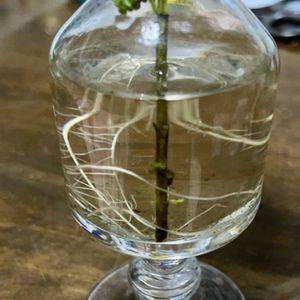 ラベンダーから根っこが出てた❣️ 冬の間、玄関に生けていたラベンダーです。花瓶に入れて放置してたのですが、何が良かったのかな? 挿木もしたことがないので、びっくりでした。 もう少ししたら土に植えます。嬉しい。😊😊😊