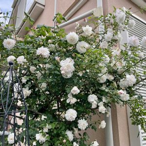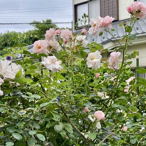 今年も咲いたルチェッタ❤️ つるバラの部類になるのか、とても大きくなり、たくさんの花❣️ 嬉しい。😍😍😍 間からクレマチスの篭口も。😍