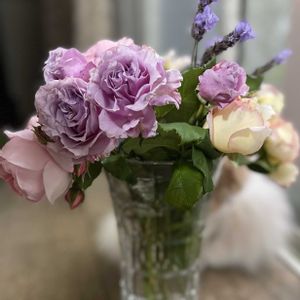 母の日なので、自分と母になった娘へのプレゼント❤️ 手前の薄紫のバラは、長女の結婚祝いで求めたバラ。記念の一株です。🩷🩷🩷