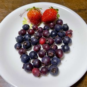 イチゴとジュンベリー😍😍😍 ベリー祭りが我が家では始まろうとしています。 この後、ブルーベリーも収穫できそうです。やはり、編みかけはヒットでしたね。🥰🥰🥰鳥さんごめんね。🙏🙏🙏