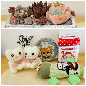 毎日寒くて凍えちゃいますね❄️ そんな毎日でしたがまつぴよさんから心温まるプレゼント🎁が届きました💖 可愛いチビニャンちゃんがペアで💕 そして牛さん模様のヤモリさんも可愛いです〜😊 モロゾフのチョコも可愛いネコちゃん缶にそしてペコちゃん牛乳パックにはミルキーが❣️盛りだくさんのプレゼント、ありがとうございました💕 寒さから避難中の多肉寄せと一緒に😊