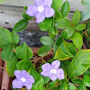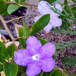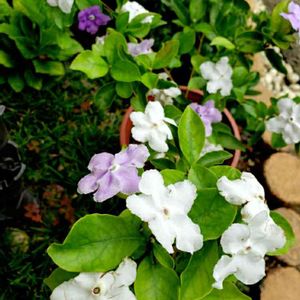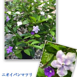 ニオイバンマツリ 実家にこの木があり、 春にこぼれんばかりの花を咲かせます。ジャスミン のような香りに包まれます💜 花色は、蕾の時は紫で💜だんだん白に変わるので、色んな色が混在して、とてもキレイ✨四季咲きなので、まだまた花が楽しめます😃 先日実家から、一枝もらって挿し木してるけど、怪しいので😱新しくお迎えしました😅
