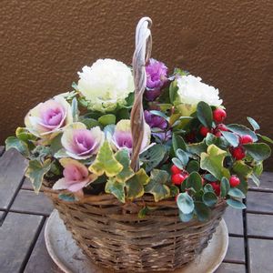 ナチュラルバスケットに!ハボタンとチェッカーベリーの寄せ植え #Garden#gardening #flower #ガーデン#ガーデニング #寄せ植え#花の寄せ植え #コンテナガーデン #花と緑のある暮らし #癒やし#メルカリ #ハボタン#鉢花#フラワー #ナチュラル#冬花#花#humminggarden