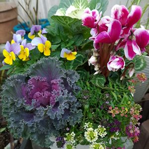 ハボタンが70円だったのでつい買ってしまって…買ってたシクラメンとビオラと寄せ植えしたけどシクラメンが大きくてバランスが……😅