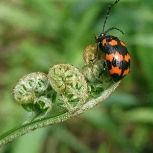 シダの若芽 止まってる鮮やかな昆虫は イタドリハムシ 別名カメノコウムシ テントウムシみたいな色合いで、カメムシみたいな姿😃 …楽しい❤