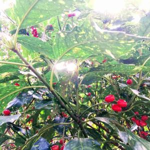 斑入りアオキ ミズキ科アオキ属 日陰でもすくすく育つのだそう。 山道の高い木々の下でも赤い実と、 星空を映したような葉を広げてた✨ 町中で見かけるアオキとは、また違った雰囲気😃