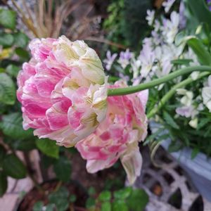 八重咲きのチューリップ🌷さん ようやく開花しました🤗🥳 でも天候は土砂降り☔️☔️🌀😱 とりあえず軒下に退避💨💨 1日でも長く咲いていてね♪😘