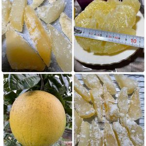 晩白柚(ばんぺいゆ) 晩白柚は蜜柑の中でも🍊大きさは、一番大きいです。 果実は、サクサクと、美味しいです。 皮は、分厚い皮で、白いところが、分厚くあります。 黄色い所をのかして、文旦漬け、 にしてみました。 久しぶりに、作りましたが、 ヤッパリ、美味しいです。色んな、お茶🍵にも、よく合います⭕️ 我が家のお庭に、植樹して、10年位になります。 此の大きな晩白柚がなり、3年前は38個 なりました。 今年は、スス病で、枝を沢山おとし、収穫出来たのは5個でした。 数が少ないだけに例年になく、大きな実がなりました。 皮まで、おいしく頂きました。 自分で植えた木、その木からの、収穫、 美味しく頂き、皮までこうして、 文旦にして、いただけた事、本当に、 感謝‼️、感激‼️の、バンペインユ‼️ そして自分で自分を褒めてあげ、 自己満足の私でした👏👏👏❣️