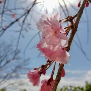 3/24山梨県の公園に咲いていました。 八重紅垂れです。 青空に映えていました。