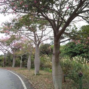 トックリキワタ通り🌸🌸🌸 花が満開でとても綺麗でした✨ ほとんどピンク色なんですが、奥の信号機🚥の左下辺りに一本だけ白のトックリキワタがあります。 拡大すると見えますよ☝️😊