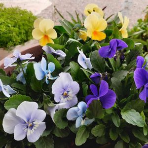 路地栽培 善財ファームさんのビオラ💛💙💜3色植え 薄い紫の中に水色が😃 同じ株でも色が微妙に違いますね!光の違いでしょうか?