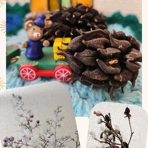 こんにちは☺️ ✨🎄✨は、 自然素材をインテリアに取り入れるのが好きです✨ 拾ったコブシの実 南天をスプレーで着色し❄を被った樹に見立てました❄ ビンは、夫がよく食べる珍味の空き瓶をクリスマス風に先ほど編みくるみました😊 小さな編みカゴには、万両の実ドライ ヒペリカムドライ 去年拾ったナンキンハゼの実です😌
