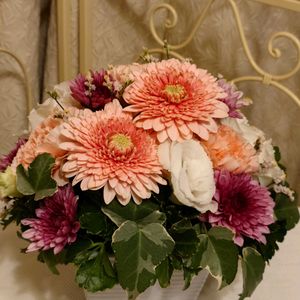 こんばんは😊 キク カーネーション トルコキキョウ 等々… 娘からアレンジメントが届きました🏵️ 明日は母の三回忌。 娘から優しかったおばあちゃんへ💐