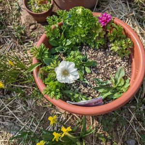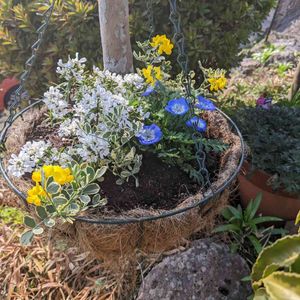 白色の寄植え、デイジー。ハナニラ、あと一つなんだっけな?🌱🌞🥳🫣💕👍💞📸バアベナァーかなぁ~🤔😄