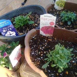サントリーフラワーズさんからのプレゼント苗🎁🌿 植え付けました(^3^)♪♪ これから先の成長が楽しみ🎶 備忘録 ・ミリオンベル2種 8号鉢にMIX植え 1回目の摘芯 ・るりいろ風車 と小梅ちゃん 6号鉢に仮植え→成長を見て鉢増し予定