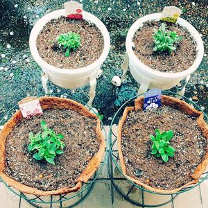 .:*:・'°☆ プレゼントの花苗4Pを 植えました ミリオンベルチェリーピンク ミリオンベルイエロー は8号鉢に サフィニアブーケ小梅ちゃん サフィニアアート るりいろ風ぐるま はハンキング植えにしようと ココヤシマットを使用 切り戻しをして ひとまわり小さくなりましたが これからどこまで大きく育つか 期待大です #花と生きるサントリー .:*:・'°☆