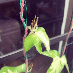 ようやく身長より高く伸びた朝顔💠もうすぐ咲きそうです✳︎これは赤系かな?