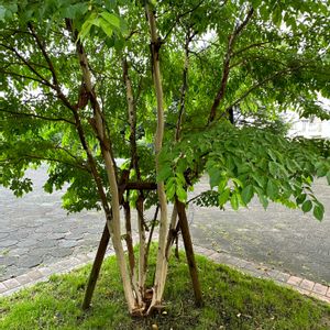2023,7,06 7:27撮影 管理人棟横の島百日紅 株立の本数も増え大きくなった。島百日紅は花の咲く前に幹の樹皮が剥がれ落ちる しろい幹と緑の葉が綺麗❣️ 花は白、サルスベリの花の半分くらいの大きさ、あまり目立たない 秋紅葉が鮮やかで目立つ 一本立の島百日紅は10mくらいの大木になる。 サルスベリは花が咲いてる時に樹皮が剥がれ落ちる