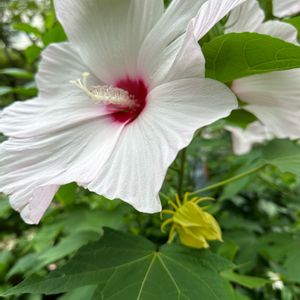2023,7,15 7:47撮影 去年60cm位だったアメリカ芙蓉 今年は130cm位大きくなってる 草芙蓉とも言われてるから今年大きくなったんだね 去年黄色の花が気になったけど近くでアップすると中に子房が膨らんでいる タネができる段階? でもどのようにしてこんな形になるんだろう❓❓❓