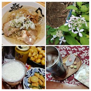 息子と🍜デート 期日前投票のあとに行きました。 冷やし煮干し中華。 煮干しと鰹節の風味がよろしい。 今年は新緑の頃の気温が上がらなかったせいか、山紫陽花がまだ咲いています。 昨日は娘がお休み。 娘と家カフェ☕ 鈴型の落雁と一緒に☕です。 夕方花トモに新じゃがを貰ったので、小さいヤツを集めて丸揚げしました。 🍺に合う〰〰🎵