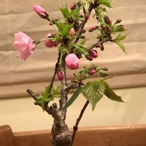 4年目の旭山桜開花です 今年は苔が枯れてしまって 幹の足元は土なので…💦 でもお花は今年も濃い色で たくさんのツボミをつけてくれてます💓 我が家にも桜🌸…開花
