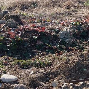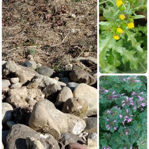 新しい借り畑 ③ 大小さまざまの石 コンクリートの破片 割れた鉢のカケラ 枯れた草の中に ノボロギク ホトケノザ 今日は雪、雨が降ったり止んだり…💦 進みません😅
