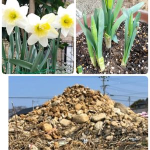 新しい借り畑 ⑤ スイセン 畑から救出した水仙咲き揃いました! 👦孫ちゃんが 手伝ってくれて… やっと大きい石拾いが終わって… もみ殻・鶏ふん・苦土石灰を ばら撒きました!