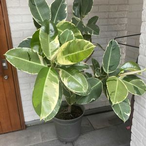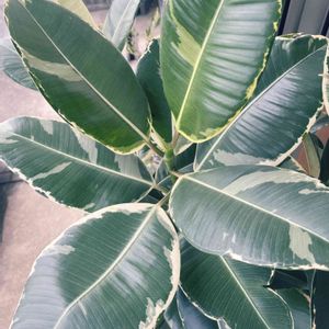 三本仕立てにしている我が家のフィカス•エラスティカ•アサヒ🪴🪴🪴 高さは鉢底から190センチに成長しました♪ 斑の入り方がティネケに少し似てますが、緑の葉っぱの縁に沿って乳白色の斑が入る珍しい覆輪斑のゴムの木🍀 これも私のお気に入りのフィカスのひとつです🤗