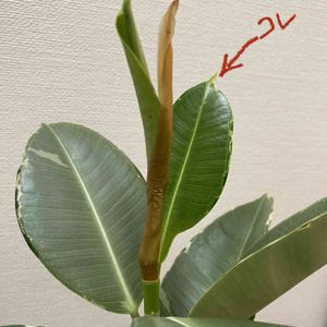 フィカス ゴムの木 大きくなって簡単そうな観葉植物が欲しくて1月の頭にお迎えしたゴムの木✨ 種類が分からないので誰か教えてください🙏 斑が少なめで葉の縁にしか無いからエラスティカ アサヒかな?と思っています。 ついこの間、赤い文字で書いたコレが展開したばかりなのにもう次の葉が開いてきました😮❣️ この時期にこんなに早く生長するなんてびっくり!?