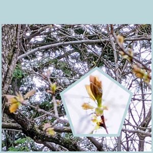 庭の鬱金桜…未だこんな蕾です 今朝花友さんが上げられた桜が鬱金桜か御衣黄かのやり取りがありましたので… これでは参考になりませんし 場所的に上の庭の石で留めた縁から手を伸ばして写してこんなもの…色的にも毎年写すのに苦労させられる桜です