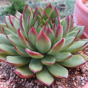 赤い縁取りが際立つエケベリアのクリスマス。夕暮れ時の撮影で色が暗めではあるけど,葉の裏の先端部分の赤が見事。