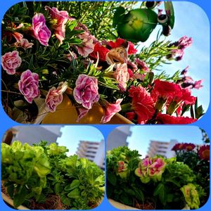 「グリーンワールド」に参加します😊しつこくてすみません、ペチュニア・湘南シリーズの3種を寄せ植えにしたものです💚わっさわっさ繁って咲いています🎶わかりやすいかなと、コラージュにしてみました😍