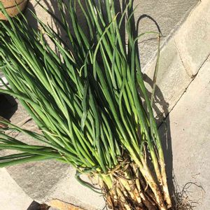 一文字の球根 香りの良い小葱に似た一文字。 葱と違うのは、球根がある事。 葉が枯れ始めたから、掘り上げて、乾かします。 そして次なる一文字に成るのです。 植えるには少し多いから、玉葱代わりに少し食べます。 大きいのは3センチほど。 少し面倒ですが。