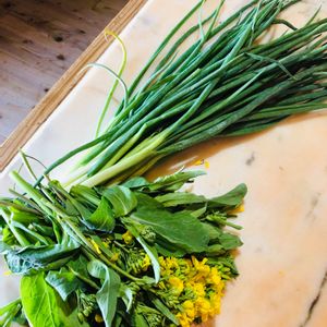 庭からの恵み お昼のお野菜 菜の花 一文字 菜の花は、オイルを少し落とした塩茹で、その茹で汁で、一文字も茹でる。 ひともじは、ぐるぐる巻きつけて、梅ジャム酢味噌をかけて頂きます。 ニンニク酢味噌も美味しい。 どっちにしようかなぁ! その茹で汁は、塩加減を吸い物の加減にして、スープにします。