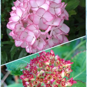 🍀アジサイ 紫陽花🍀 15年程前に挿し芽用に貰ったアジサイです。☺️ 毎年少し色の変化がありますが、可愛く咲いていてくれます。 下の⬇️5/9の蕾の時は赤くて、赤い花が咲くと思いきや、ピンクの覆輪咲きになります。🎶 📛名前はわかりません。 候補は ピコティ、リップル、 未来、ママンレッド、フウラミカコ どなたかご存知ないでしょうか? 追記 2025.9.13 じぇっとんさんに『未来』と教えてもらいました。♥