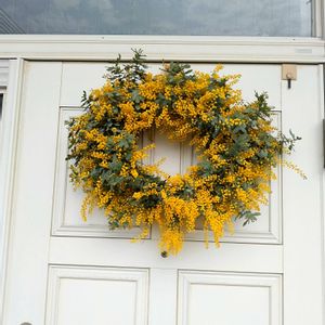友達からたくさんミモザを貰ったので ミモザリース🟡 作りました 玄関が華やなになりました💛
